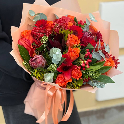 Букет "Красный закат" из калл, роз, калины, скиммии, гиперикума, сафари, гербер и капса