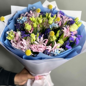 Букет "Загадка вечности" из гиацинтов, нерине, тюльпанов и оксипеталума