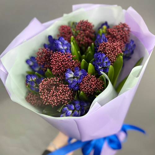 Букет "Твой яркий день" из гиацинтов и скиммии