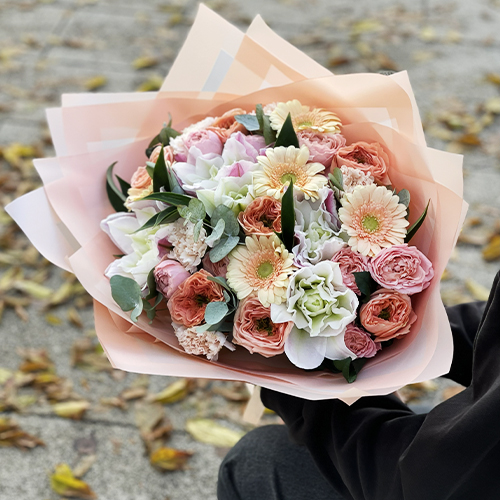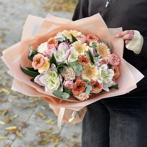 Букет "Лиссабон" из пионовидных роз, поновидных лилий и гербер